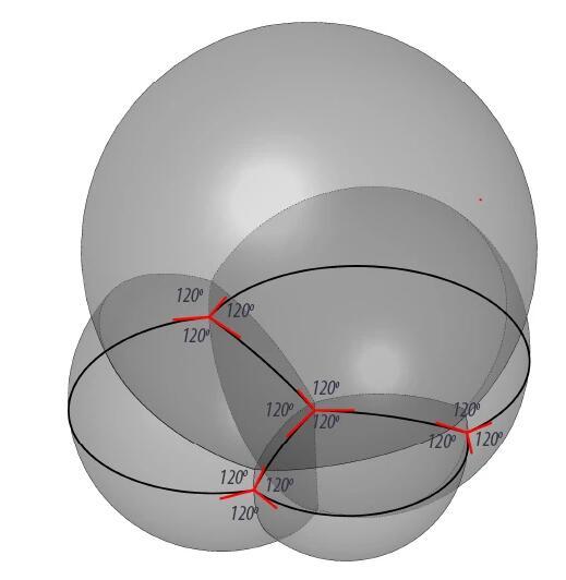 現在我們知道了表面張力決定泡泡的連接方式,泡沫總會找到一種具有最小表面張力的結構,也就是使總表面積最小的結構。但是,關于泡沫的結構還需要考慮另一個問題,即力學上的穩定。在連接點處,沿著不同方向的作用力必須達到平衡。無論是泡泡筏的平鋪還是泡泡堆的四面相連,都是能滿足這一要求的連接方式。