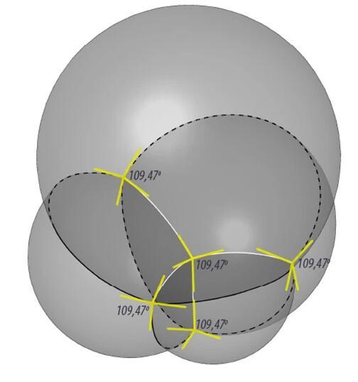 如果我們從平面的泡泡筏推演到立體的“泡泡堆”,結果也是類似的。假如你用吸管對著一碗肥皂水吹氣,吹起一堆泡沫,你會看到,當泡泡堆積在一起之后,它們四面邊界相交于一個點,夾角約為109°——沒錯,這個角度就是正四面體中心到各頂點連線的夾角。