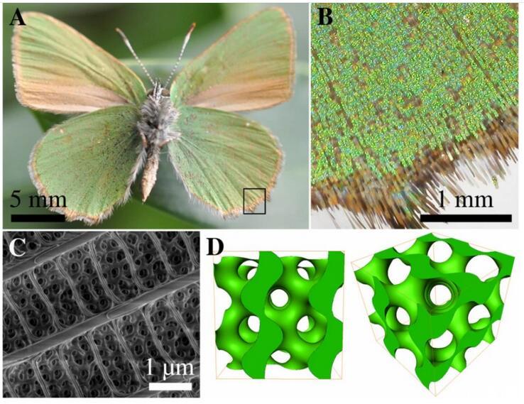 有些種類的蝴蝶,例如歐洲的黃星綠小灰蝶(green hairstreak,Callophrys rubi)和寬絨番鳳蝶(emerald-patched cattleheart,Parides sesostris),其翅膀鱗片上就有一種周期性極小曲面——螺旋二十四面體(gyroid)。從曲面的凸起處和從其他結構處反射回來的光波之間會發生干涉,波長的變化也就意味著顏色的消失或出現。這就是翅膀鱗片產生顏色的特別技巧。
