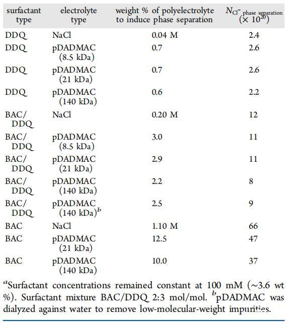 觀察到顯示分離相分離的NaCl/表面活性劑/水混合物,以產(chǎn)生富含表面活性劑的上層相,類似于聚電解質(zhì)/表面活性劑/水混合物中的相分離。這說明,對于pDADMAC(21 kDa)和NaCl系統(tǒng),可以通過改變BAC/DDQ的比率來控制相界。