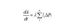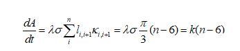 下面我們推導(dǎo)二維泡沫的演變方程,由于任一氣泡跟周圍氣泡的氣體交換都是通過(guò)氣泡邊界進(jìn)行的,則氣泡體積(二維氣泡用面積表示)隨時(shí)間的變化率跟邊界長(zhǎng)度和邊界上的壓強(qiáng)差都有關(guān)系,可以表示為