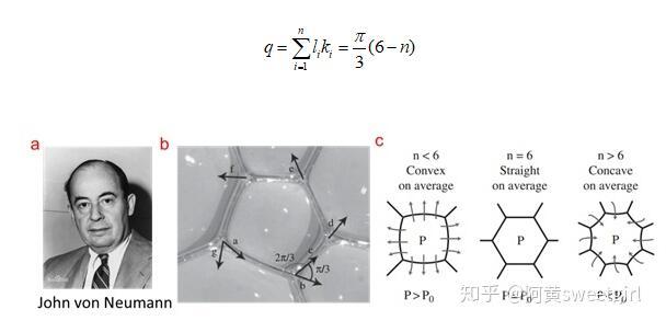 比如,依據(jù)Plateau第一定律,可以推出,相鄰三個(gè)相互接觸的氣泡的三條邊界上的曲率之和為零(Curvature sum rule)。其中最重要地是1952年von Neumann利用它推導(dǎo)出了二維泡沫的演變方程(Ref 3)。