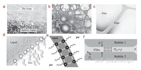 圖1.不同尺度下的泡沫結(jié)構(gòu)及穩(wěn)定機(jī)制(Ref 1)(a)整個(gè)泡沫結(jié)構(gòu),尺度為0.01 m至1 m。(b)干泡沫的放大部分,尺度為0.1 mm至1 cm。(c)液體通道,也叫Plateau邊界,尺度為1 um至0.1 mm以及肥皂泡膜,尺度為10 nm到1 um。(d)氣液界面的分子層結(jié)構(gòu),尺度為0.1 nm到10 nm。e-f)氣泡膜在界面靜電力排斥作用即楔裂壓(disjoining pressure)的作用下而穩(wěn)定存在。