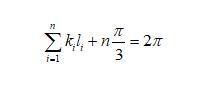 假設(shè)二維干泡沫中的任一氣泡如圖3b所示,氣泡的邊數(shù)為n,從a點(diǎn)開(kāi)始,再回到a的邊長(zhǎng)分別標(biāo)記為l1到ln,每邊所對(duì)應(yīng)的曲率為k1到kn(Plateau第一定律)?,F(xiàn)在假設(shè)有一點(diǎn)從a點(diǎn)沿著邊向b運(yùn)動(dòng),到b點(diǎn)時(shí),所走的路徑為l1,轉(zhuǎn)動(dòng)的角度為這條邊所對(duì)應(yīng)的圓心角(向外為正,向內(nèi)為負(fù)值),為k1*l1。此時(shí)要想繼續(xù)沿著邊運(yùn)動(dòng),需要向內(nèi)轉(zhuǎn)動(dòng)π/3角度(根據(jù)Plateau第二定律),如圖3b所示。轉(zhuǎn)動(dòng)后繼續(xù)運(yùn)動(dòng),直到到達(dá)原來(lái)的點(diǎn)a。此過(guò)程,n條邊總共在頂點(diǎn)處轉(zhuǎn)動(dòng)的角度為nπ/3,在邊上轉(zhuǎn)動(dòng)的角度為
