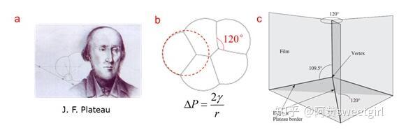 泡沫物理學(xué)集中于研究泡沫的結(jié)構(gòu)、靜力學(xué)、動(dòng)態(tài)演變及排液等內(nèi)容。它是一個(gè)十分古老的學(xué)科,由比利時(shí)物理學(xué)家Plateau在19世紀(jì)中葉開(kāi)創(chuàng)(圖2a)。Plateau在數(shù)十年的失明的時(shí)光里,依舊通過(guò)指導(dǎo)他侄子做試驗(yàn),堅(jiān)持研究肥皂泡薄膜的幾何形態(tài)及其背后隱藏的力學(xué)規(guī)律。1873年,他和侄子把自己的實(shí)驗(yàn)現(xiàn)象和分析結(jié)果做了系統(tǒng)整理,以法文發(fā)表,從此把對(duì)泡沫結(jié)構(gòu)的研究由定性印象推到了量化階段,開(kāi)創(chuàng)了泡沫物理學(xué)(Ref 2)。在泡沫靜力學(xué)方面,Plateau的主要貢獻(xiàn)在于其提出了干泡沫的靜態(tài)結(jié)構(gòu)力學(xué)的三定律,它是后續(xù)泡沫研究的基石: