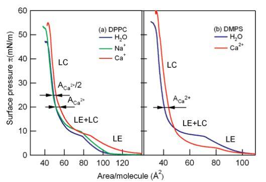 對于1 M Ca2+溶液上的DMPS單分子膜,與觀察到的純水共存區的π)10 mN/M壓力相比,LE+LC平臺壓力降低到π)5 mN/M;在較高的表面壓力(π>20 mN/m)下,兩條等溫線的位移保持等于Ca2+足跡,4?2/脂,未觀察到明顯轉變為2:1脂/Ca2+復合物。