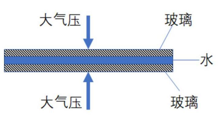 流行科普上講,由于玻璃之間充滿(mǎn)了水,它們之間沒(méi)有空氣,因而靠大氣壓就可以把它們緊密地?cái)D壓在一起。如下圖所示: