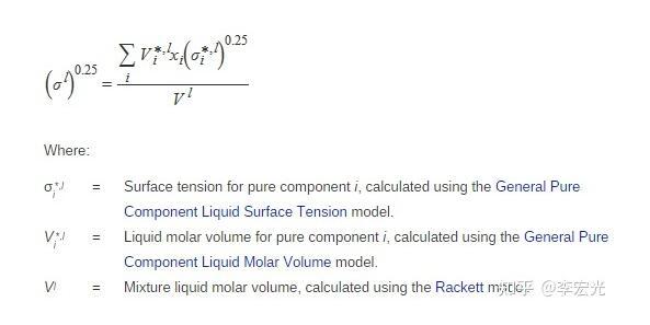 液體的表面張力系數,是液體本身的一種性質,主要由液體本身決定。純物質液體表面張力可用Macleod-Sugden 法 、Sastri-Rao 法、Brock-Bird 法或Pitzer 法估計[1]。純物質液體表面張力可用擴展的Macleod-Sugden 法估計[2]: