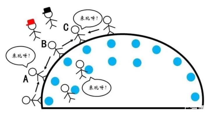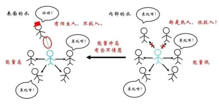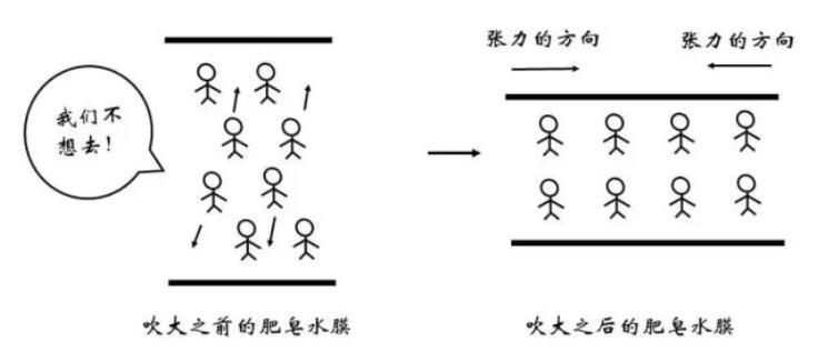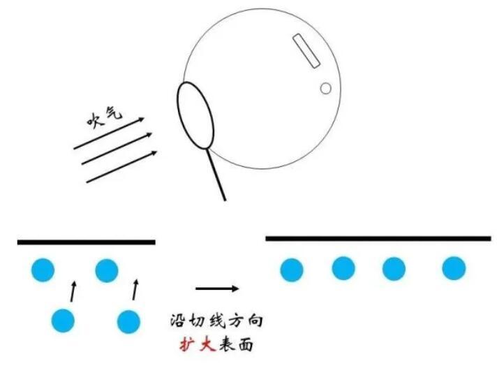 俗話說(shuō)“物以類聚,人以群分”,更加相似的同類分子間往往關(guān)系更為融洽,而不同種分子間的關(guān)系則相對(duì)疏遠(yuǎn)。在物理上表現(xiàn)為同類分子間的勢(shì)能曲線最低點(diǎn)更低。因此,對(duì)于一個(gè)存在于內(nèi)部的水分子,如果來(lái)到表面,需要斷開(kāi)與同類分子的部分關(guān)系,而代之以與比較“生疏”的空氣分子間的作用,顯然是不情愿的!這體現(xiàn)為能量的升高。那么,什么情況下水分子要從內(nèi)部來(lái)到表面呢?正是吹泡泡的時(shí)候。