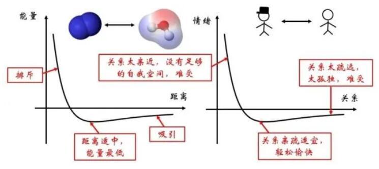 在微觀世界存在著多種多樣的分子,比如上圖所示的氮?dú)馀c水分子。分子間組成的體系的勢(shì)能與分子間的距離有關(guān)。這種關(guān)系正如兩個(gè)人之間的關(guān)系,遠(yuǎn)了近了都不好。如果距離太近,彼此之間沒(méi)了自我空間,情緒會(huì)不穩(wěn)定,因此會(huì)產(chǎn)生相互排斥的作用;如果距離太遠(yuǎn),每個(gè)人都太孤獨(dú),便會(huì)相互思念,彼此吸引。當(dāng)彼此的距離恰到好處,便對(duì)應(yīng)著能量的最低點(diǎn),較為穩(wěn)定。