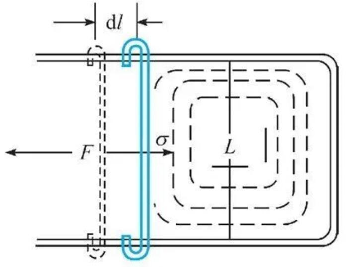 我們?cè)?jīng)提到比表面能的單位是J/m,而將這個(gè)物理量從力的角度去理解對(duì)于處理一些問(wèn)題更加直觀,我們常常將比表面能稱為表面張力。而J/m=N/m,并不是力的單位N,因此表面張力代表的是作用在單位長(zhǎng)度的表面上的力。在下圖所示的實(shí)驗(yàn)中,肥皂水膜在力F的牽拉下長(zhǎng)大,表面張力便是