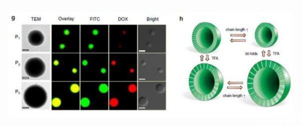 當(dāng)加入三氟乙酸試劑之后,即可調(diào)控氫鍵的相互作用,實現(xiàn)囊泡的可逆"呼吸"。同時,囊泡的尺寸也能在5-30倍的范圍內(nèi)實現(xiàn)可逆變化。