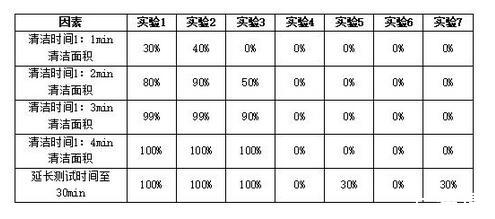 通過(guò)實(shí)驗(yàn)1我們發(fā)現(xiàn):在浸泡清洗中各組分均能達(dá)到較好的清潔效果,但各組分最終清潔時(shí)間有差異,具體數(shù)據(jù)如下表