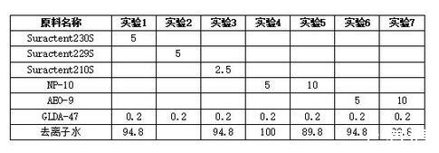 結(jié)合實(shí)驗(yàn)1、實(shí)驗(yàn)2的實(shí)驗(yàn)可以明顯看出特種表活在除重油垢時(shí)的效果可以達(dá)到一個(gè)較普通常規(guī)表面活性劑更優(yōu)異的效果,尤其是在常溫、常壓、低濃度清洗時(shí),作用尤為明顯。在金屬清潔劑、金屬表面處理劑的實(shí)際應(yīng)用中上述的多種特種表活可以直接應(yīng)用于替代常規(guī)的NP類、AEO類表面活性劑,進(jìn)行使用。