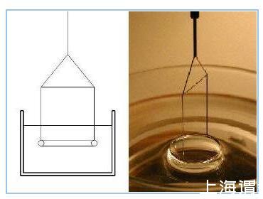 掛環(huán)法(Du Nouy Ring method):這可能是測量表面/界面張力的最經(jīng)典方法,文獻(xiàn)上報(bào)道的許多液體的表/界面張力值是用這一方法測得,它甚至可以在很難浸濕的情況下被使用。用一個(gè)初始浸在液體的環(huán)從液體中拉出一個(gè)液體膜(類似肥皂泡),同時(shí)測量提高環(huán)的高度時(shí)所需要施加的力。