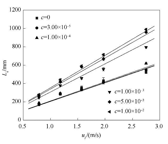 為了定量表征表面張力變化對(duì)射流破裂過(guò)程的影響,實(shí)驗(yàn)測(cè)量了含表面活性劑射流的射流破裂長(zhǎng)度。射流破裂長(zhǎng)度定義為噴嘴出口至射流首次發(fā)生破裂處的距離。圖6是含表面活性劑射流破裂長(zhǎng)度隨射流速度u l的變化趨勢(shì),其中L s(mm)表示含表面活性劑射流的射流破裂長(zhǎng)度,L l(mm)為水的射流破裂長(zhǎng)度。從圖6(a)中可以看出,當(dāng)表面活性劑濃度保持不變時(shí),提高液體射流速度會(huì)增大射流破裂長(zhǎng)度。從圖6(b)中可以看出,當(dāng)液體射流速度保持不變時(shí),隨著表面活性劑濃度的增大,射流破裂長(zhǎng)度總體上呈現(xiàn)逐漸增大的趨勢(shì);射流速度越大,射流破裂長(zhǎng)度增大的趨勢(shì)就越明顯。使用相同工況下水的射流破裂長(zhǎng)度無(wú)量綱化含表面活性劑射流的破裂長(zhǎng)度后,可以得到射流破裂長(zhǎng)度比隨射流速度以及表面活性劑濃度的變化趨勢(shì),如圖6(c)、(d)所示。從圖中可以看出,表面活性劑的加入顯著增大了射流破裂長(zhǎng)度比。在表面活性劑濃度不變時(shí),提高液體射流速度對(duì)射流破裂長(zhǎng)度比的影響并不顯著。在射流速度保持不變時(shí),提高表面活性劑濃度會(huì)導(dǎo)致射流破裂長(zhǎng)度比的增大。