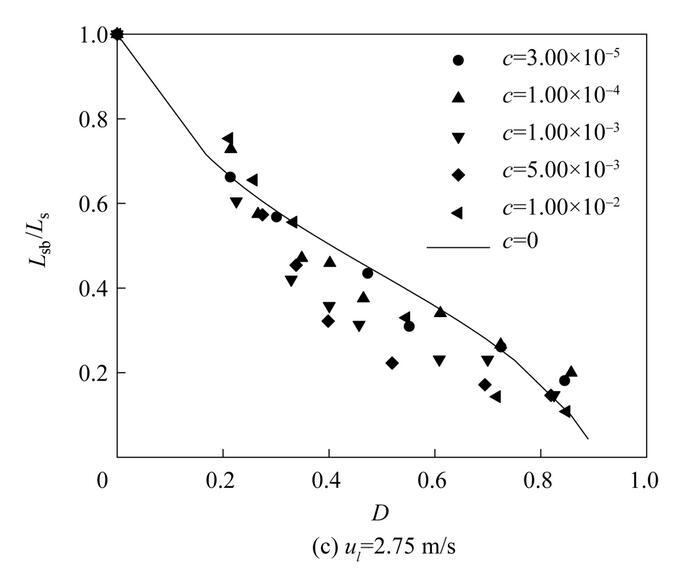 圖11是不同濃度表面活性劑射流破裂長(zhǎng)度L sb隨氣泡無(wú)量綱直徑D=d b/d 0(d b為氣泡直徑)的變化。從圖中可以看出,不同表面活性劑濃度下,射流破裂長(zhǎng)度隨氣泡無(wú)量綱直徑D的變化趨勢(shì)是相似的。射流破裂長(zhǎng)度隨著氣泡直徑的增大逐漸減??;當(dāng)氣泡直徑相同時(shí),提高液體射流速度會(huì)導(dǎo)致更大的射流破裂長(zhǎng)度。