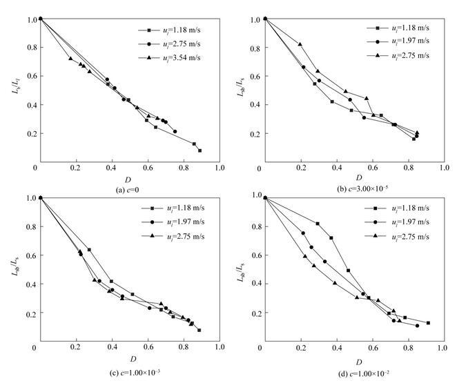 如圖12所示,當(dāng)氣泡直徑較大時(shí),破裂長(zhǎng)度比基本不隨射流速度的改變而改變。這是由于此時(shí)氣泡引起的射流速度擾動(dòng)對(duì)射流破裂的影響占主導(dǎo)地位。在氣泡直徑較小時(shí),當(dāng)表面活性劑濃度c<1.00×10-2,不同射流速度下射流破裂長(zhǎng)度比基本相同。當(dāng)表面活性劑濃度c=1.00×10-2,破裂長(zhǎng)度比隨著射流速度的增大而逐漸減小。這可能與被削弱的Marangoni效應(yīng)有關(guān)。由式(10)可知,液體射流速度越大,液體對(duì)流造成的表面活性劑表面吸附量減少的趨勢(shì)越強(qiáng),波峰波谷間的表面張力差值越小,Marangoni效應(yīng)越弱,射流破裂長(zhǎng)度增加的趨勢(shì)越弱。因此,在氣泡較小時(shí),隨著射流速度的增大,含氣泡射流的破裂長(zhǎng)度比逐漸減小。在表面活性劑濃度較小時(shí),氣泡的存在進(jìn)一步減小了射流內(nèi)部表面活性劑的濃度,從而使得不同射流速度下Marangoni效應(yīng)的差別不明顯,不同射流速度下射流破裂長(zhǎng)度比基本相同。