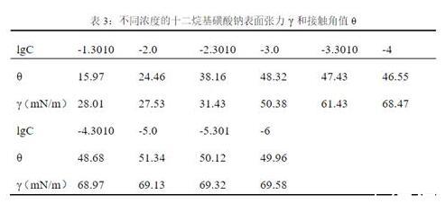 取不同濃度的十二烷基磺酸鈉溶液各25mL,與其濃度相同的枯草菌脂肽鈉溶液25mL混合,使其濃度比約為1。對(duì)混合溶液攪拌,靜止30min,用表面張力儀測試其表面張力和接觸角。其原始數(shù)據(jù)如下表: