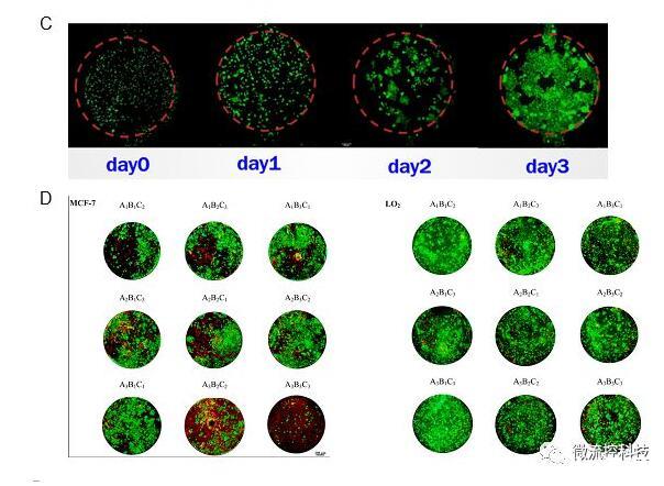 圖4A.微流控腫瘤微陣列藥物測試系統(tǒng)包含一種復合式結(jié)構(gòu)開放式微流控芯片以及移液工作站;B.微流控芯片上腫瘤微環(huán)境重建的示意圖。3D培養(yǎng)腫瘤細胞模擬腫瘤實質(zhì),水凝膠模擬支持和滋養(yǎng)腫瘤細胞的腫瘤基質(zhì),納米孔薄膜擴散屏障模擬血管內(nèi)皮層;C.微流控芯片上連續(xù)三天內(nèi)MCF-7乳腺癌細胞增殖情況。(Calcein-AM/EthD-1染色,比例尺:200μm);D.抗腫瘤藥物正交組合測試結(jié)果。藥物測試包括LO2肝細胞和MCF-7乳腺癌細胞對A.阿霉素,B.紫杉醇和C.順鉑的3因素3水平正交組合藥物的反應(yīng)。