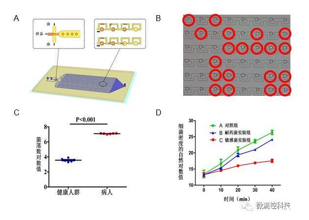 圖3A.液滴微流控芯片原理設(shè)計圖結(jié)構(gòu)包含上游的液滴生成區(qū)和下游的液滴捕獲區(qū);B.利用液滴熒光成像分辨細菌陽性和陰性液滴;C.液滴數(shù)字化分析顯示健康人和尿路感染病人尿液細菌計數(shù)差別;D.液滴數(shù)字化分析顯示敏感和耐藥細菌對于抗生素的反應(yīng)。