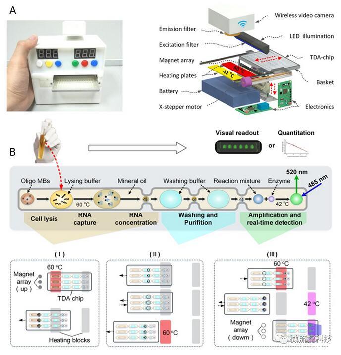 作者課題組最近發(fā)展一種液滴陣列微流控芯片核酸分析系統(tǒng)[10]。這種便攜式系統(tǒng)包含機械、磁力和光學檢測單元,其設(shè)計理念是平衡集成、通量、成本及便攜性等關(guān)鍵因素,發(fā)展適合于現(xiàn)場應(yīng)用的病原篩查工具。系統(tǒng)所用微流控芯片上設(shè)計有多組以狹縫通道連通的串聯(lián)微池,全部分析試劑均以油包水形式預存儲于其中。由于表面張力效應(yīng),油相可以浸潤微池和狹縫而水相不能。利用磁鐵陣列驅(qū)動磁珠在串聯(lián)液滴中穿行,程序化完成細胞裂解-核酸結(jié)合、磁珠洗滌、核酸洗脫、擴增/檢測等一系列步驟,從而實現(xiàn)自動化和平行化核酸分析。該系統(tǒng)極為緊湊,適合于現(xiàn)場快速檢測及醫(yī)院門急診場景下的“隨到隨檢、快速響應(yīng)”需求。課題組將這一系統(tǒng)用于性傳播疾病病原篩查,淋病奈瑟菌、沙眼衣原體、解脲脲原體、生殖支原體等四種病原的篩查可在45 min內(nèi)完成。