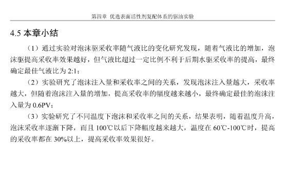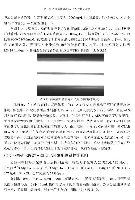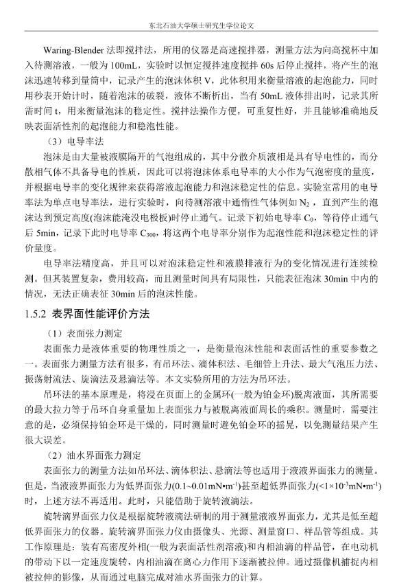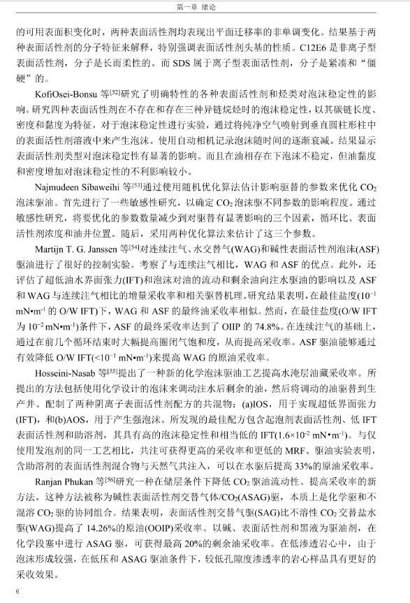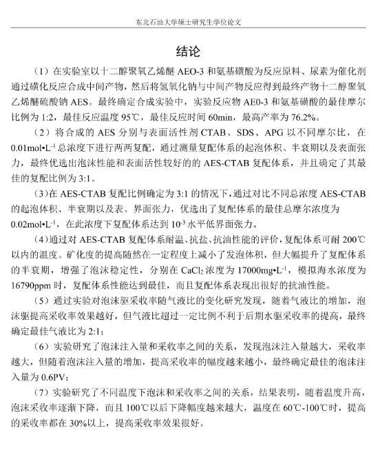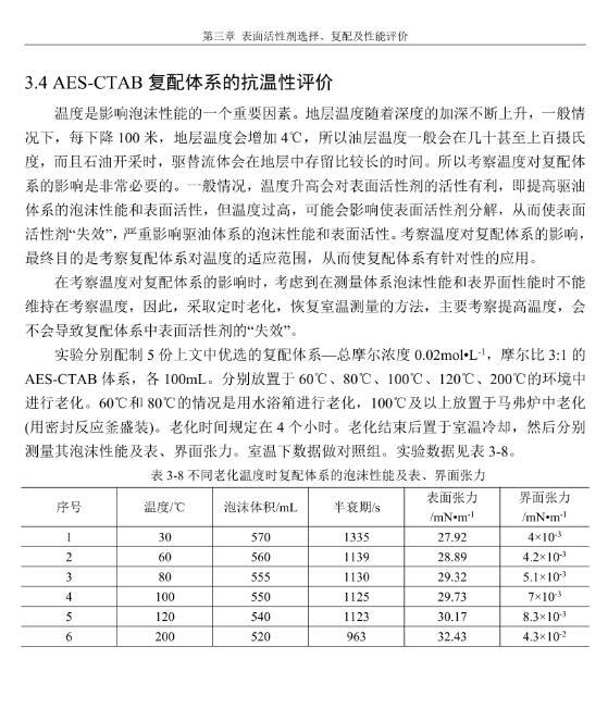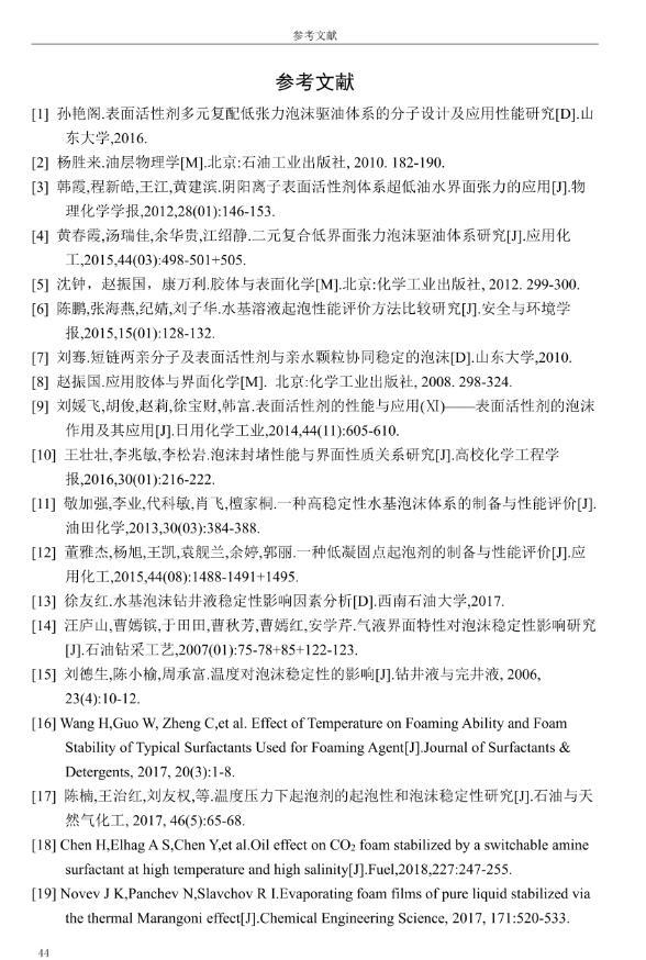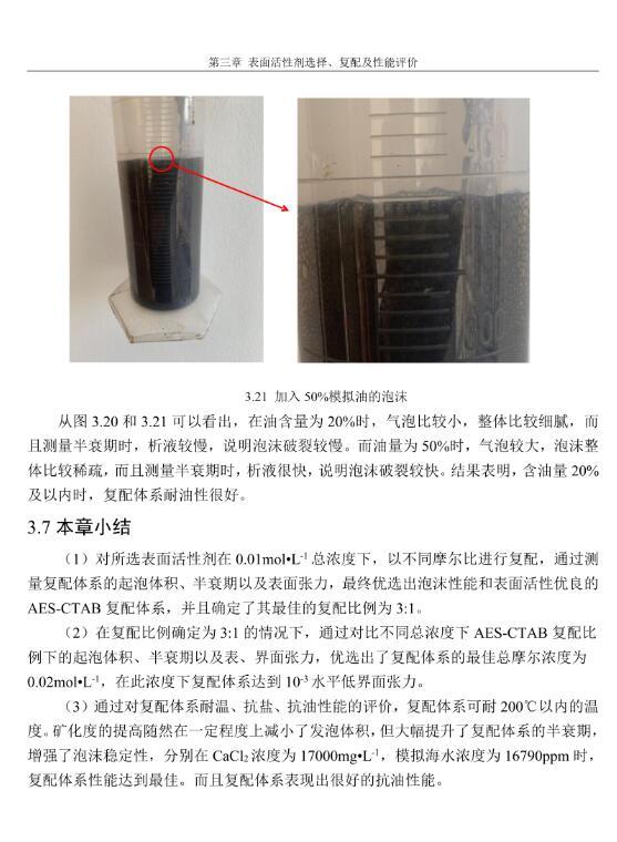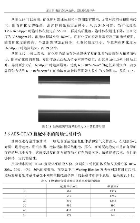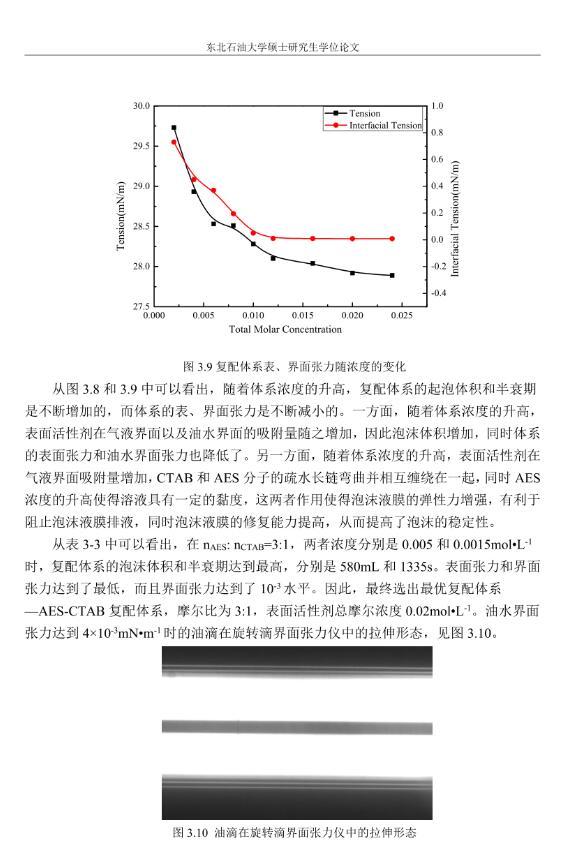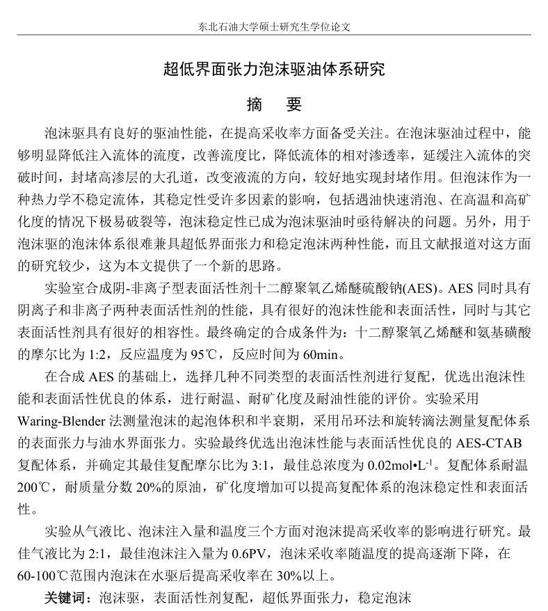 【摘要】:泡沫驅(qū)具有良好的驅(qū)油性能,在提高采收率方面?zhèn)涫荜P(guān)注。在泡沫驅(qū)油過程中,能夠明顯降低注入流體的流度,改善流度比,降低流體的相對滲透率,延緩注入流體的突破時間,封堵高滲層的大孔道,改變液流的方向,較好地實(shí)現(xiàn)封堵作用。但泡沫作為一種熱力學(xué)不穩(wěn)定流體,其穩(wěn)定性受許多因素的影響,包括遇油快速消泡、在高溫和高礦化度的情況下極易破裂等,泡沫穩(wěn)定性已成為泡沫驅(qū)油時亟待解決的問題。另外,用于泡沫驅(qū)的泡沫體系很難兼具超低界面張力和穩(wěn)定泡沫兩種性能,而且文獻(xiàn)報道對這方面的研究較少,這為本文提供了一個新的思路。實(shí)驗(yàn)室合成陰-非離子型表面活性劑十二醇聚氧乙烯醚硫酸鈉(AES)。AES同時具有陰離子和非離子兩種表面活性劑的性能,具有很好的泡沫性能和表面活性,同時與其它表面活性劑具有很好的相容性。最終確定的合成條件為:十二醇聚氧乙烯醚和氨基磺酸的摩爾比為1:2,反應(yīng)溫度為95℃,反應(yīng)時間為60min。在合成AES的基礎(chǔ)上,選擇幾種不同類型的表面活性劑進(jìn)行復(fù)配,優(yōu)選出泡沫性能和表面活性優(yōu)良的體系,進(jìn)行耐溫、耐礦化度及耐油性能的評價。實(shí)驗(yàn)采用Waring-Blender法測量泡沫的起泡體積和半衰期,采用吊環(huán)法和旋轉(zhuǎn)滴法測量復(fù)配體系的表面張力與油水界面張力。實(shí)驗(yàn)最終優(yōu)選出泡沫性能與表面活性優(yōu)良的AES-CTAB復(fù)配體系,并確定其最佳復(fù)配摩爾比為3:1,最佳總濃度為0.02mol·L-1。復(fù)配體系耐溫200℃,耐質(zhì)量分?jǐn)?shù)20%的原油,礦化度增加可以提高復(fù)配體系的泡沫穩(wěn)定性和表面活性。實(shí)驗(yàn)從氣液比、泡沫注入量和溫度三個方面對泡沫提高采收率的影響進(jìn)行研究。最佳氣液比為2:1,最佳泡沫注入量為0.6PV,泡沫采收率隨溫度的提高逐漸下降,在60-100℃范圍內(nèi)泡沫在水驅(qū)后提高采收率在30%以上。