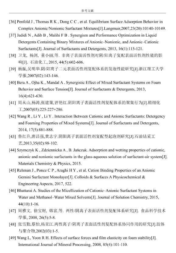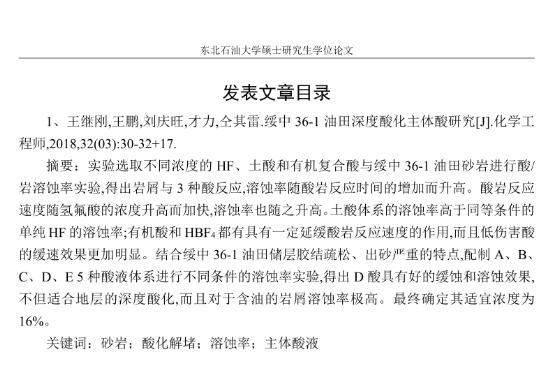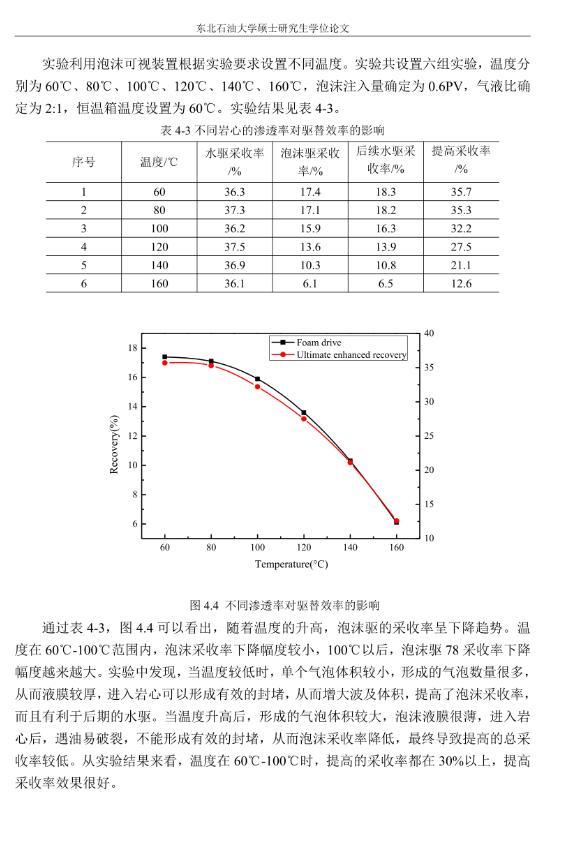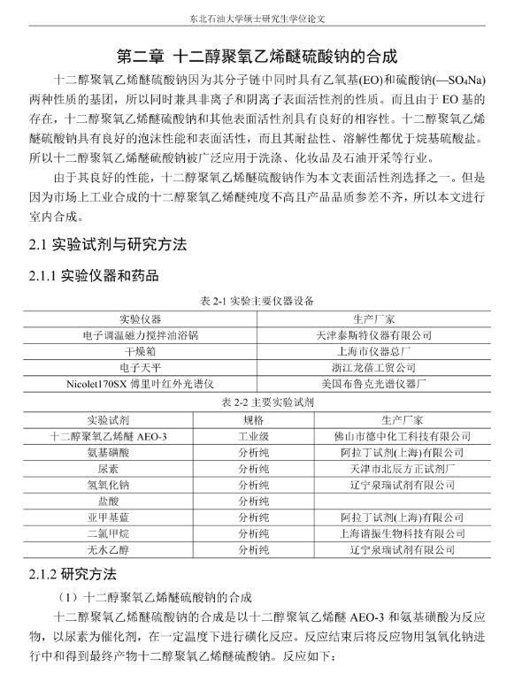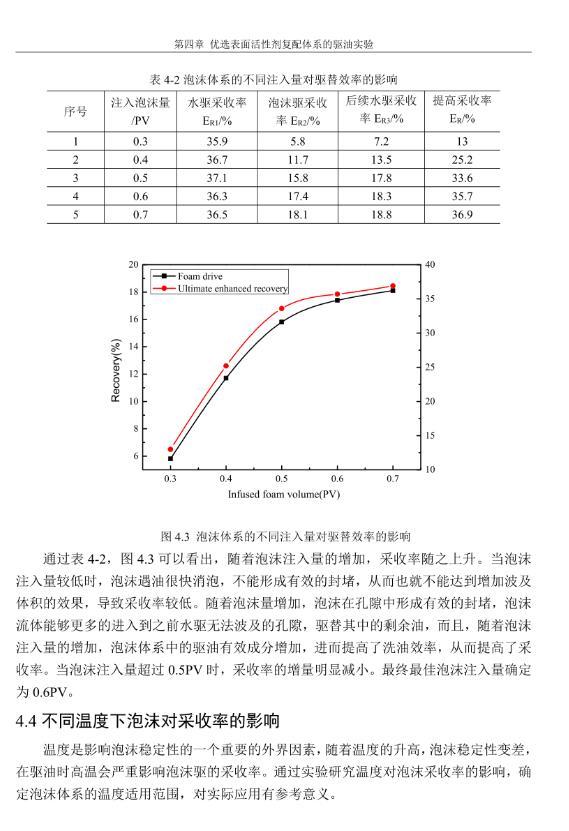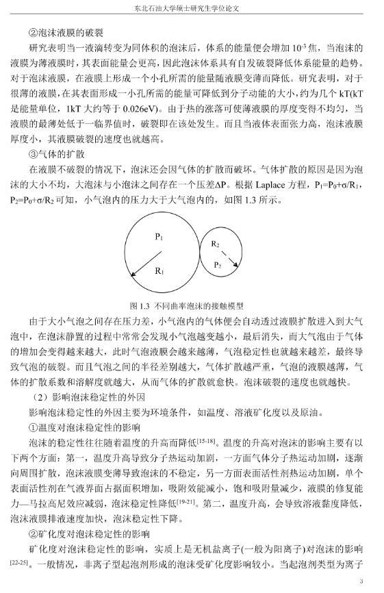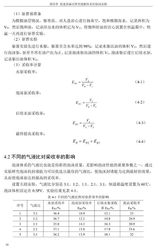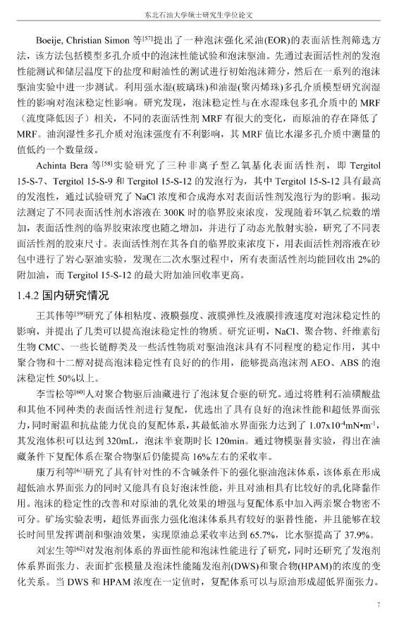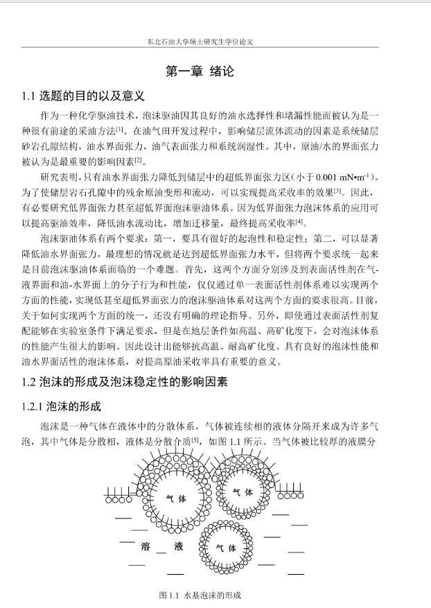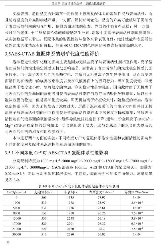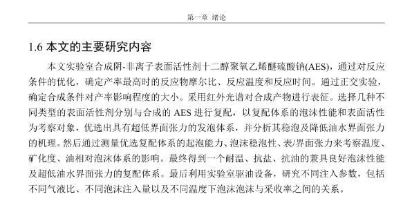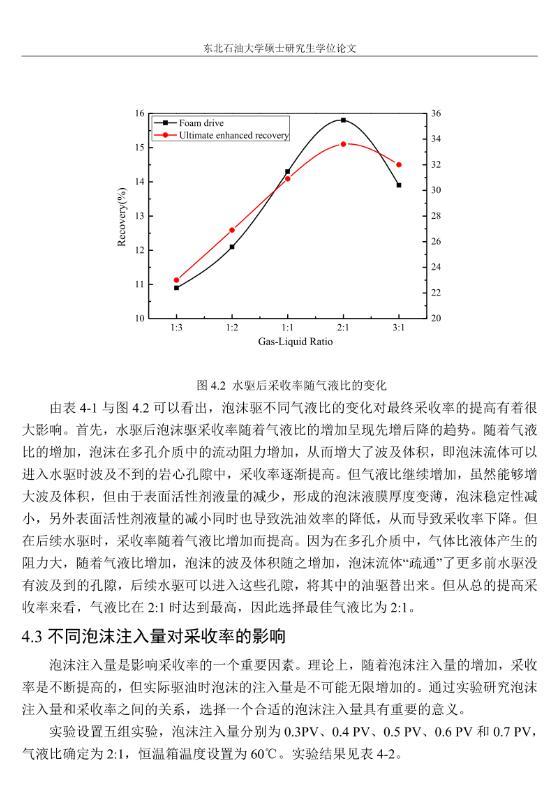 【摘要】:泡沫驅(qū)具有良好的驅(qū)油性能,在提高采收率方面?zhèn)涫荜P(guān)注。在泡沫驅(qū)油過程中,能夠明顯降低注入流體的流度,改善流度比,降低流體的相對滲透率,延緩注入流體的突破時間,封堵高滲層的大孔道,改變液流的方向,較好地實(shí)現(xiàn)封堵作用。但泡沫作為一種熱力學(xué)不穩(wěn)定流體,其穩(wěn)定性受許多因素的影響,包括遇油快速消泡、在高溫和高礦化度的情況下極易破裂等,泡沫穩(wěn)定性已成為泡沫驅(qū)油時亟待解決的問題。另外,用于泡沫驅(qū)的泡沫體系很難兼具超低界面張力和穩(wěn)定泡沫兩種性能,而且文獻(xiàn)報道對這方面的研究較少,這為本文提供了一個新的思路。實(shí)驗(yàn)室合成陰-非離子型表面活性劑十二醇聚氧乙烯醚硫酸鈉(AES)。AES同時具有陰離子和非離子兩種表面活性劑的性能,具有很好的泡沫性能和表面活性,同時與其它表面活性劑具有很好的相容性。最終確定的合成條件為:十二醇聚氧乙烯醚和氨基磺酸的摩爾比為1:2,反應(yīng)溫度為95℃,反應(yīng)時間為60min。在合成AES的基礎(chǔ)上,選擇幾種不同類型的表面活性劑進(jìn)行復(fù)配,優(yōu)選出泡沫性能和表面活性優(yōu)良的體系,進(jìn)行耐溫、耐礦化度及耐油性能的評價。實(shí)驗(yàn)采用Waring-Blender法測量泡沫的起泡體積和半衰期,采用吊環(huán)法和旋轉(zhuǎn)滴法測量復(fù)配體系的表面張力與油水界面張力。實(shí)驗(yàn)最終優(yōu)選出泡沫性能與表面活性優(yōu)良的AES-CTAB復(fù)配體系,并確定其最佳復(fù)配摩爾比為3:1,最佳總濃度為0.02mol·L-1。復(fù)配體系耐溫200℃,耐質(zhì)量分?jǐn)?shù)20%的原油,礦化度增加可以提高復(fù)配體系的泡沫穩(wěn)定性和表面活性。實(shí)驗(yàn)從氣液比、泡沫注入量和溫度三個方面對泡沫提高采收率的影響進(jìn)行研究。最佳氣液比為2:1,最佳泡沫注入量為0.6PV,泡沫采收率隨溫度的提高逐漸下降,在60-100℃范圍內(nèi)泡沫在水驅(qū)后提高采收率在30%以上。