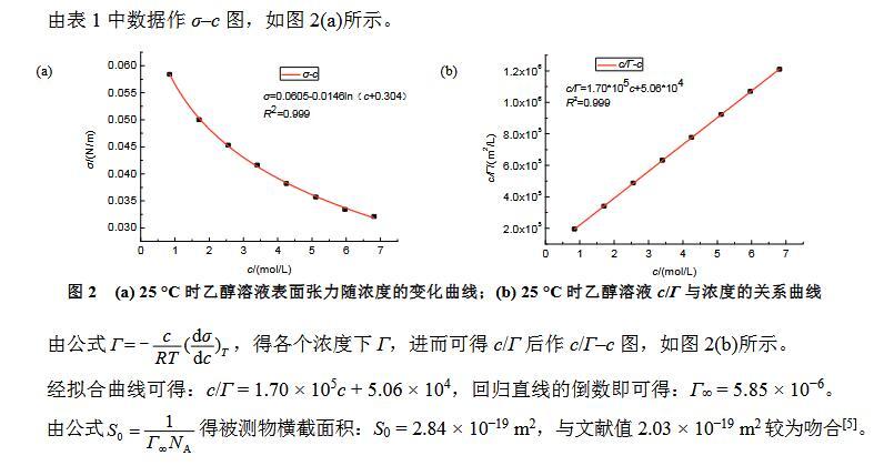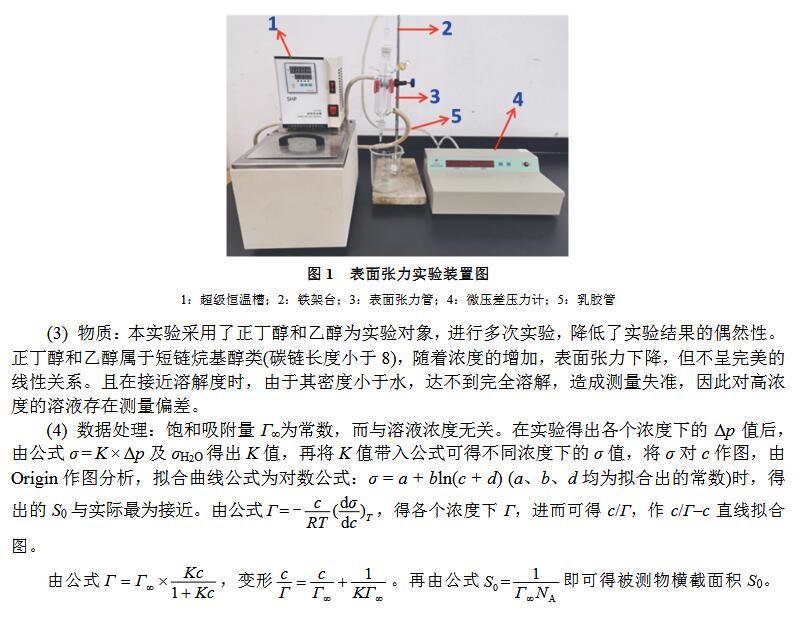 最大氣泡壓力法是大學(xué)物理化學(xué)實(shí)驗(yàn)中測定溶液表面張力的一個(gè)經(jīng)典方法[1–3]。由于最大泡壓法測定溶液表面張力實(shí)驗(yàn)裝置較為簡單,學(xué)生也易于理解其原理,且不用測定液體密度ρ和接觸角θ,因而成為測定溶液表面張力的一個(gè)基本物理化學(xué)實(shí)驗(yàn)[4]。通過實(shí)驗(yàn)可以鞏固及加深理解有關(guān)溶液表面吸附的理論知識,通過數(shù)據(jù)處理可以熟練掌握其有關(guān)方程式。但由于各方面條件的局限,學(xué)生所測試的實(shí)驗(yàn)數(shù)據(jù)與文獻(xiàn)值不能較好吻合。鑒于此,在已有的實(shí)驗(yàn)裝置下,對實(shí)驗(yàn)進(jìn)行了細(xì)致的條件探索,如:更換測試物,變換溫度和細(xì)化溶液的濃度等,以期得到與文獻(xiàn)較吻合的實(shí)驗(yàn)數(shù)據(jù),從而為教師及本科生等相關(guān)實(shí)驗(yàn)人員提供一定的理論指導(dǎo)。