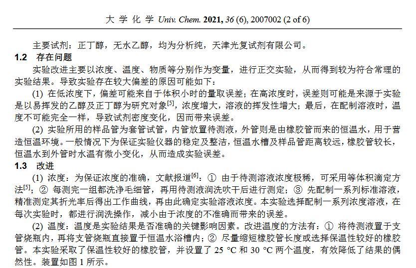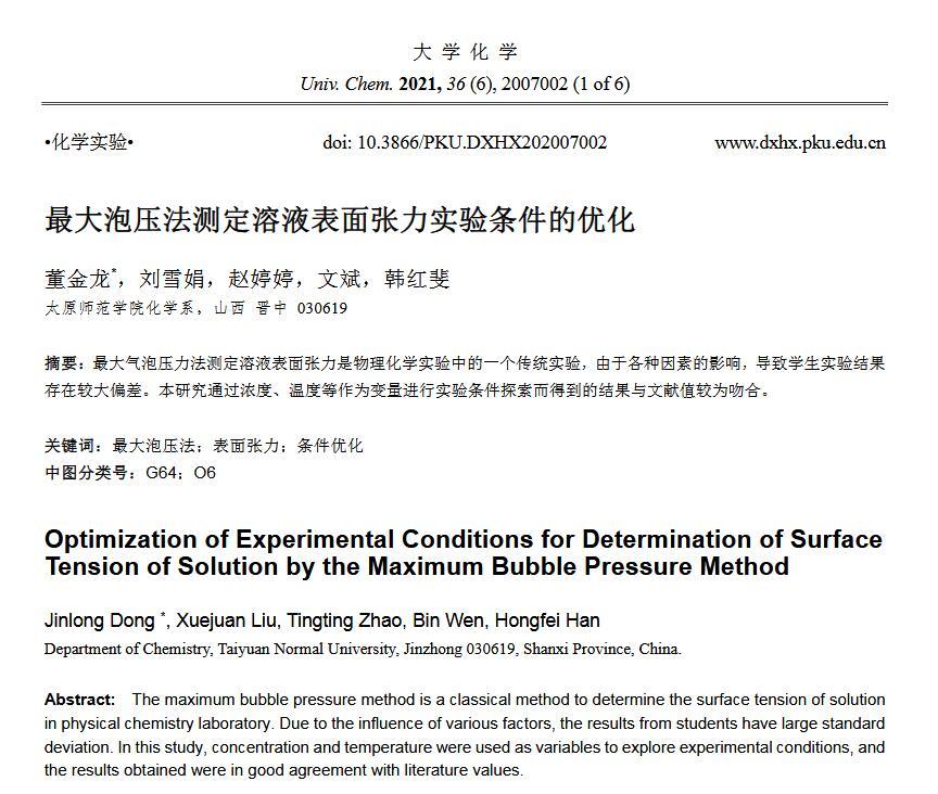 【摘要】:最大氣泡壓力法測定溶液表面張力是物理化學(xué)實(shí)驗(yàn)中的一個(gè)傳統(tǒng)實(shí)驗(yàn),由于各種因素的影響,導(dǎo)致學(xué)生實(shí)驗(yàn)結(jié)果存在較大偏差。本研究通過濃度、溫度等作為變量進(jìn)行實(shí)驗(yàn)條件探索而得到的結(jié)果與文獻(xiàn)值較為吻合。