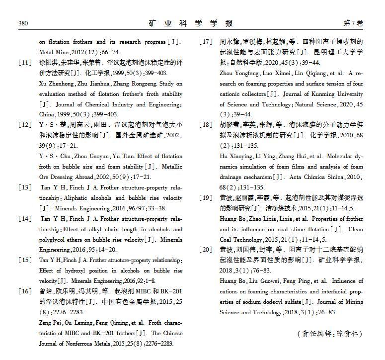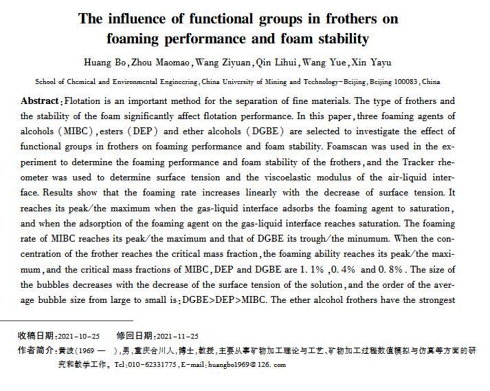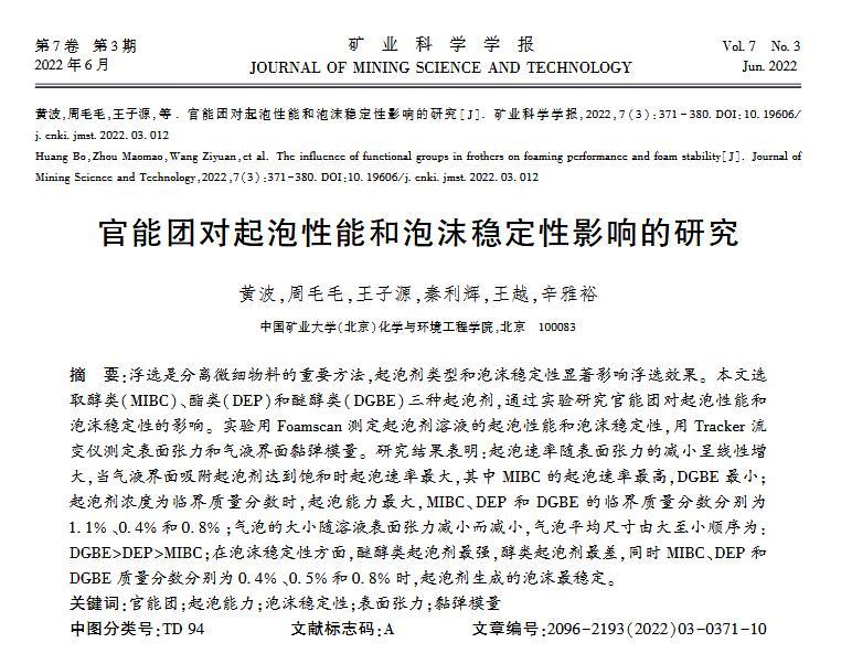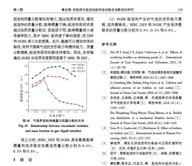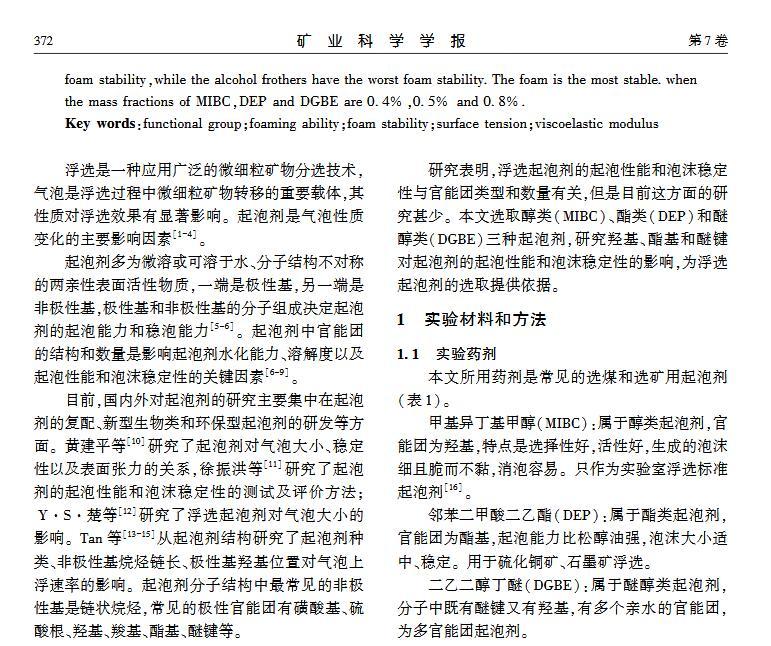 【摘要】:浮選是分離微細(xì)物料的重要方法,起泡劑類型和泡沫穩(wěn)定性顯著影響浮選效果。本文選取醇類(MIBC)、酯類(DEP)和醚醇類(DGBE)三種起泡劑,通過實驗研究官能團(tuán)對起泡性能和泡沫穩(wěn)定性的影響。實驗用Foamscan測定起泡劑溶液的起泡性能和泡沫穩(wěn)定性,用Tracker流變儀測定表面張力和氣液界面黏彈模量。研究結(jié)果表明:起泡速率隨表面張力的減小呈線性增大,當(dāng)氣液界面吸附起泡劑達(dá)到飽和時起泡速率最大,其中MIBC的起泡速率最高,DGBE最小;起泡劑濃度為臨界質(zhì)量分?jǐn)?shù)時,起泡能力最大,MIBC、DEP和DGBE的臨界質(zhì)量分?jǐn)?shù)分別為1.1%、0.4%和0.8%;氣泡的大小隨溶液表面張力減小而減小,氣泡平均尺寸由大至小順序為:DGBEDEPMIBC;在泡沫穩(wěn)定性方面,醚醇類起泡劑最強,醇類起泡劑最差,同時MIBC、DEP和DGBE質(zhì)量分?jǐn)?shù)分別為0.4%、0.5%和0.8%時,起泡劑生成的泡沫最穩(wěn)定。