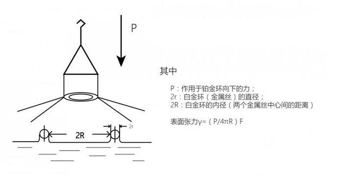 鉑金環(huán)是用直徑0.37mm的鉑金絲做成周長為60mm的環(huán),測試時先將鉑金環(huán)浸入液面(或二種不相混合的界面)下2-3mm,然后再慢慢將鉑金環(huán)向上提,環(huán)與液面會形成一個膜。膜對鉑金環(huán)會有一個向下拉的力,測量整個鉑金環(huán)上提過程中膜對環(huán)的所作用的最大力值,再換算成真正的表面(界面)張力值。由于鉑金環(huán)法測試起來比較麻煩,測試誤差也比較大,已迅速被鉑金板法所取代。