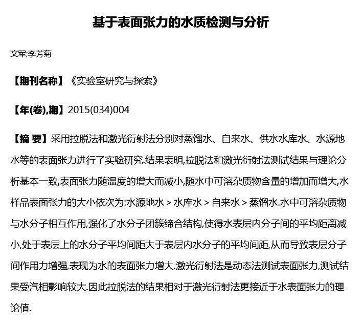 【摘要】:采用拉脫法和激光衍射法分別對蒸餾水、自來水、供水水庫水、水源地水等的表面張力進行了實驗研究。結果表明,拉脫法和激光衍射法測試結果與理論分析基本一致,表面張力隨溫度的增大而減小,隨水中可溶雜質物含量的增加而增大,水樣品表面張力的大小依次為:水源地水水庫水自來水蒸餾水。水中可溶雜質物與水分子相互作用,強化了水分子團簇締合結構,使得水表層內分子間的平均距離減小,處于表層上的水分子平均間距大于表層內水分子的平均間距,從而導致表層分子間作用力增強,表現為水的表面張力增大。激光衍射法是動態法測試表面張力,測試結果受汽相影響較大。因此拉脫法的結果相對于激光衍射法更接近于水表面張力的理論值。