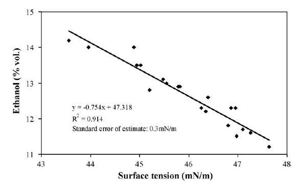 如統(tǒng)計(jì)分析所示,乙醇、單寧和蛋白質(zhì)是與表面張力最相關(guān)的三個(gè)參數(shù)。 一方面考慮到它們?cè)卺劸茖W(xué)上的重要性,另一方面考慮到它們的測(cè)定方法費(fèi)力,我們使用回歸分析研究了各種數(shù)學(xué)模型,目的是通過簡單的表面測(cè)量獲得評(píng)估其濃度水平的預(yù)測(cè)模型。緊張。 正如預(yù)期的那樣,最適合的模型用于估計(jì)乙醇含量。 描述它的散點(diǎn)圖和線性方程如圖 2 所示。該模型將乙醇濃度的變化解釋為 91.4%,估計(jì)的標(biāo)準(zhǔn)誤差等于 0.3 mN/m。