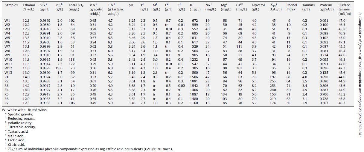 檢測(cè)到乙醇、蛋白質(zhì)和單寧對(duì)水性、水醇和模型葡萄酒標(biāo)準(zhǔn)溶液的表面張力有顯著影響,以及上述基質(zhì)之間的重要變化后,我們認(rèn)為繼續(xù)對(duì)真實(shí)葡萄酒樣品進(jìn)行研究很有趣。 我們的目標(biāo)是評(píng)估盡可能多的其他葡萄酒化合物對(duì)表面張力的影響,獲得統(tǒng)計(jì)相關(guān)性,最后,基于對(duì)葡萄酒表面張力的簡單測(cè)量,獲得基本釀酒參數(shù)值的預(yù)測(cè)模型。