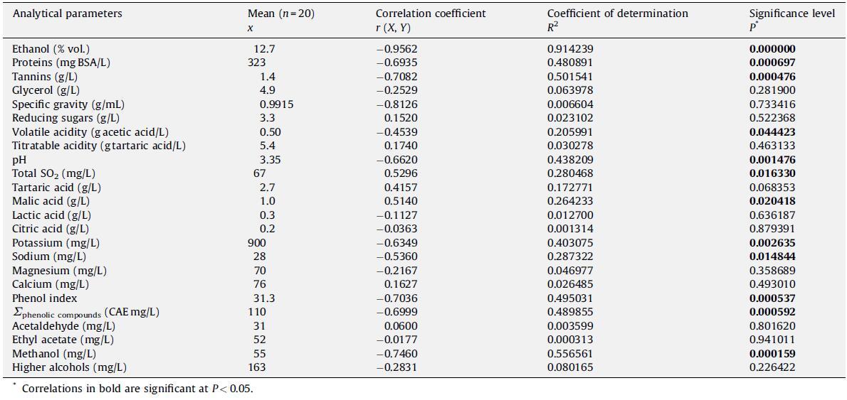統(tǒng)計(jì)分析顯示,在檢查的 24 個(gè)分析參數(shù)中,有 12 個(gè)與表面張力顯著相關(guān)(P < 0.05)(表 4)。 其中有 10 個(gè)(乙醇、蛋白質(zhì)、單寧、揮發(fā)性酸度、pH、鉀、鈉、甲醇和總酚——280 nm 吸光度和 HPLC 測(cè)定)具有負(fù)相關(guān)系數(shù),表明它們與表面張力成反比,較高的它們的值,樣品的表面張力越低。 另外兩個(gè)(蘋果酸和總 SO2)具有正相關(guān)系數(shù)。 測(cè)量的最小 P 值 (P = 0.000000) 對(duì)應(yīng)于乙醇,第二小 (P = 0.000476) 對(duì)應(yīng)于單寧,表明這兩個(gè)參數(shù)與表面張力的相關(guān)性最好。 不出所料,還原糖和比重根本沒有關(guān)聯(lián),因?yàn)樘欠肿颖憩F(xiàn)出高水溶性并且?guī)缀鯖]有表面活性。