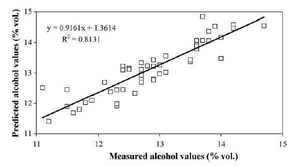 為了測(cè)試乙醇預(yù)測(cè)模型,我們分析了第二組 30 個(gè)葡萄酒樣品。 所提出的線性模型預(yù)測(cè)的值與葡萄酒酒精度等級(jí)的測(cè)量值的圖如圖 3 所示。更新的模型解釋了 81.3% 的乙醇含量變化,而現(xiàn)在估計(jì)的標(biāo)準(zhǔn)誤差為 0.36 % (v/v)。 盡管必須進(jìn)一步優(yōu)化,但該統(tǒng)計(jì)工具為文獻(xiàn)中現(xiàn)有的那些提供了一種額外的方法,用于簡單快速地估計(jì)靜止葡萄酒的酒精等級(jí)(Rocchia 等,2007a,b)。