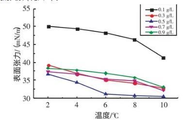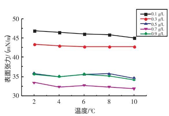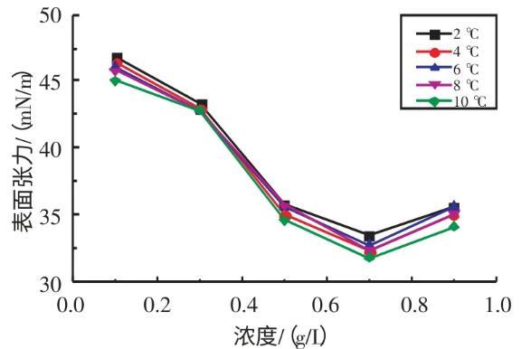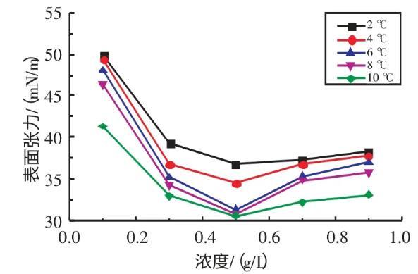 2.2.1不同溫度下十二烷基苯磺酸鈉溶液表面張力與濃度的關(guān)系實(shí)驗(yàn)研究了在溫度為2、4、6、8、10℃條件下,SDBS溶液的表面張力與濃度的關(guān)系(見圖3)。由圖3可知,當(dāng)濃度在0.1~0.7 g/L時,隨著SDBS溶液濃度的升高,其表面張力逐漸減小;當(dāng)濃度在0.7~0.9 g/L時,隨著SDBS溶液濃度的升高,其表面張力逐漸增大。當(dāng)SDBS溶液濃度為0.7 g/L時,其表面張力取得最小值。