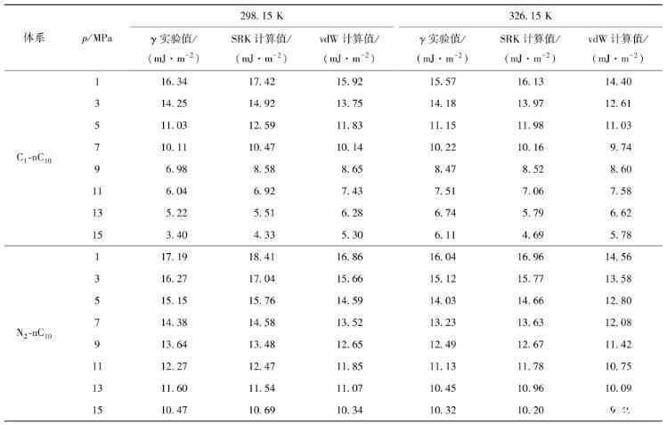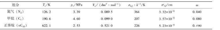 Zhang等[11]設(shè)計(jì)出納米實(shí)驗(yàn)裝置,并測(cè)量甲烷-正葵烷(C1-nC10)和氮?dú)?正葵烷(N2-nC10)混合物在納米孔(rp=50 nm)中的界面張力,其具體測(cè)量值見表1。對(duì)比實(shí)驗(yàn)測(cè)量的界面張力與模型預(yù)測(cè)值,是檢驗(yàn)建模正確性的重要方法之一。因此,筆者對(duì)不同溫度下的C1-nC10和N2-nC10混合物的界面張力進(jìn)行預(yù)測(cè),其使用到的純組分狀態(tài)方程參數(shù)列于表2。