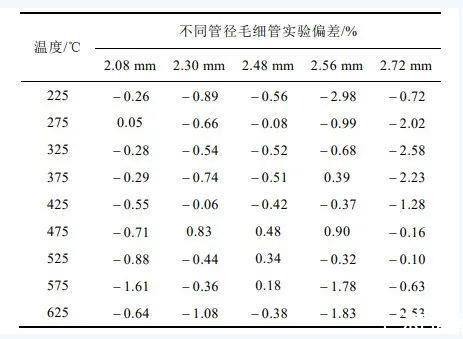 不同管徑毛細管在不同溫度下實驗結(jié)果偏差如上表2所示。可知,2.72 mm內(nèi)徑毛細管與基準值偏差最大,且在不同溫度的實驗偏差波動也是最大,從表中結(jié)果可以得出,隨著毛細管內(nèi)徑增大,實驗結(jié)果偏差和偏差波動隨之增大。而2.08mm、2.30mm、2.48mm三個管徑的偏差相差不大,且從低溫到高溫偏差范圍波動較小。因此,在均勻鼓泡下,實驗使用的毛細管管徑應(yīng)控制在2.0~2.5mm。