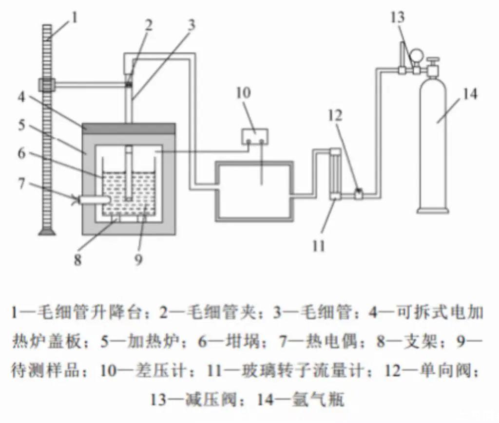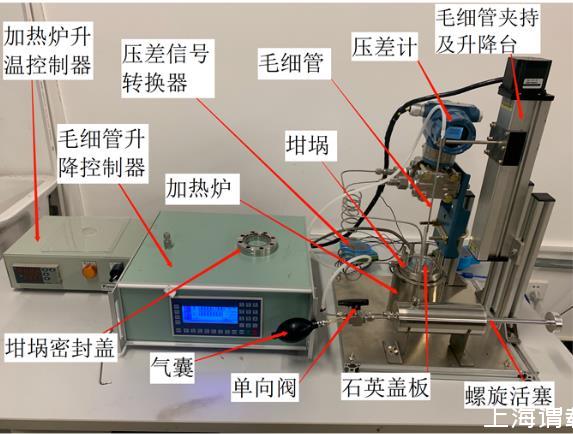 下圖為本文設(shè)計的測量裝置原理示意圖與實物圖,該裝置主要由4個系統(tǒng)組成:氣路系統(tǒng)、毛細管升降系統(tǒng)、加熱恒溫系統(tǒng)以及數(shù)據(jù)采集系統(tǒng)。