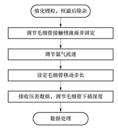 被測材料為鋰粒,純度為99.974%,總金屬雜質(zhì)為260×10-6。鼓泡所用氣體為高純氬氣,純度≥99.999%,符合GB/T 4842—2017標準。為避免高溫環(huán)境下雜質(zhì)對實驗結(jié)果的影響,將實驗臺架放置在充氬氣環(huán)境的手套箱內(nèi),箱內(nèi)壓力為+200~400Pa,氧含量小于0.5×10-6,水含量小于0.2×10-6。實驗基本流程如圖3所示。