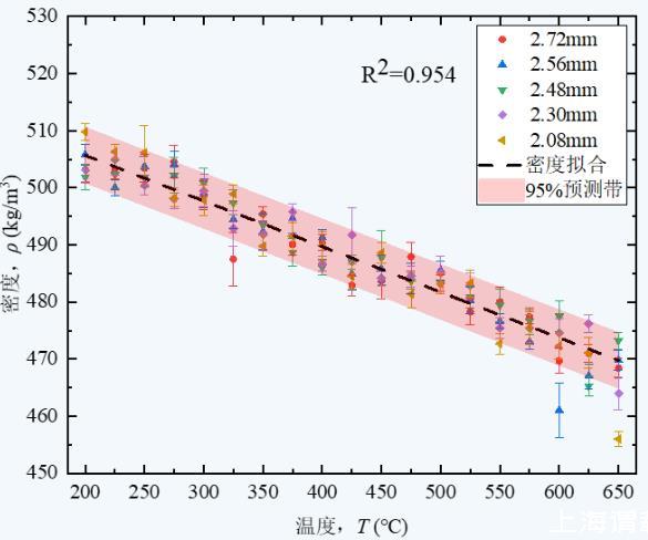 上圖5給出了溫度T在200~650℃范圍內(nèi),使用不同管徑毛細管測量的液態(tài)鋰密度實驗值及其擬合曲線。可知,擬合結(jié)果具有良好線性度。各個溫度點的密度實驗結(jié)果偏差小于±5 kg/m3,相對誤差為±1%,且實驗結(jié)果均在線性擬合95%預(yù)測帶中,其中預(yù)測帶表示對多次實驗結(jié)果分析,充分考慮實驗偶然誤差,單次實驗結(jié)果在預(yù)測帶之間,說明實驗結(jié)果具有較好可信度。