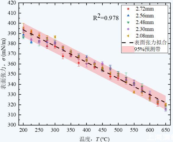 上圖6給出了溫度T在200~650℃范圍內(nèi),使用不同管徑毛細管測量的液態(tài)鋰表面實驗值及其擬合曲線。可知,擬合結(jié)果具有良好線性度。各個溫度點的密度實驗結(jié)果偏差小于±5 mN/m,相對誤差為±1.4%,且實驗結(jié)果均在線性擬合95%預(yù)測帶中,說明實驗結(jié)果具有較好可信度。